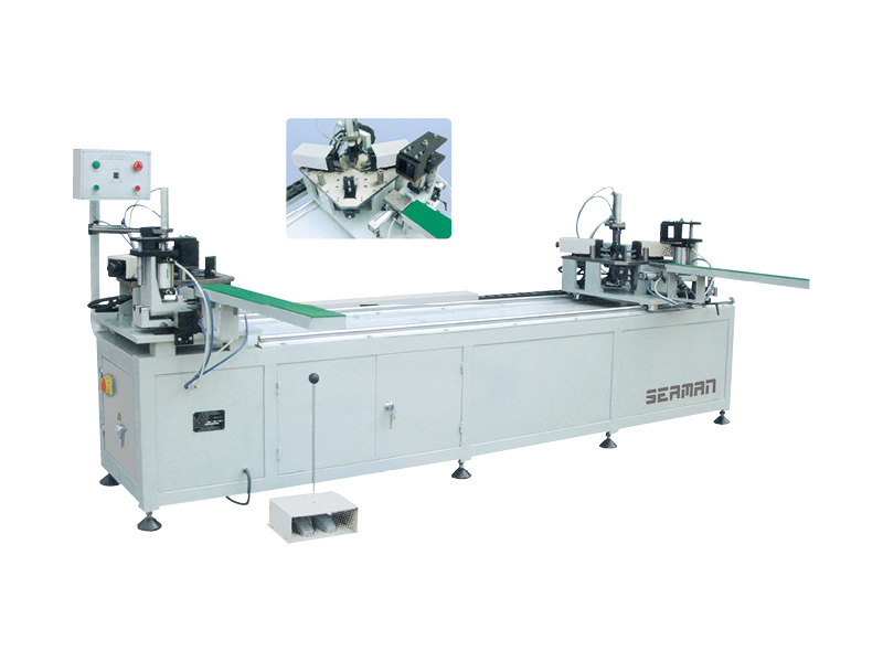 鋁門窗雙頭組角機是高檔鋁門窗專用設備,可一次完成兩個角的角碼式?jīng)_鉚聯(lián)接。